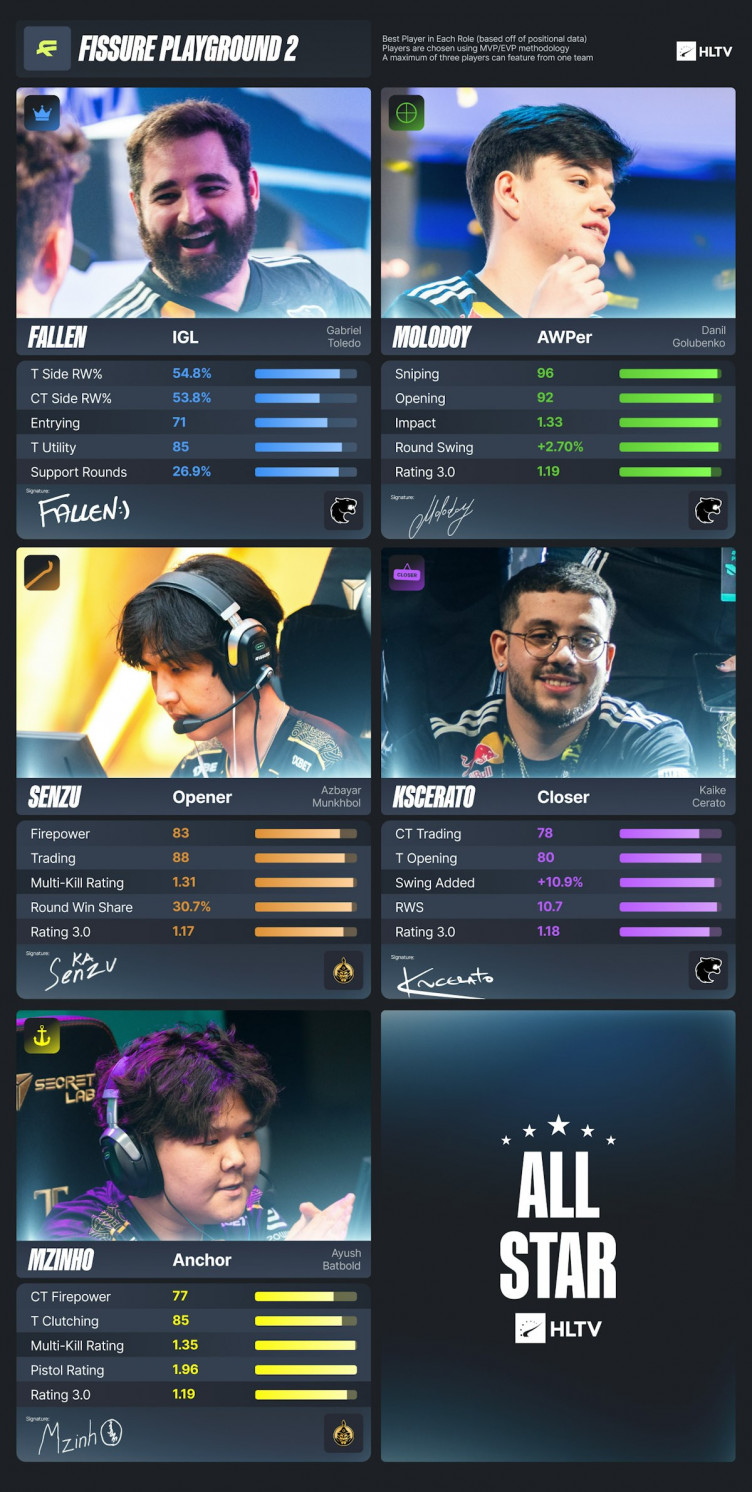 HLTV also presented an all-star roster of the best FISSURE Playground 2 players in each role – two representatives of The MongolZ and three FURIA players.