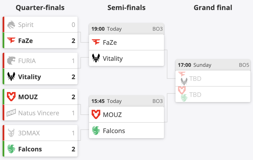 In the first round of the playoffs, Team Spirit lost to FaZe (9:13 on Nuke, 5:13 on Mirage), while FURIA got bested by Vitality (13:9 on Overpass, 7:13 on Inferno, 7:13 on Nuke). The losing squads shared 5th-8th places with 3DMAX and NAVI, each receiving $18,000 in prizes. The winners advanced to the event's semi-finals.