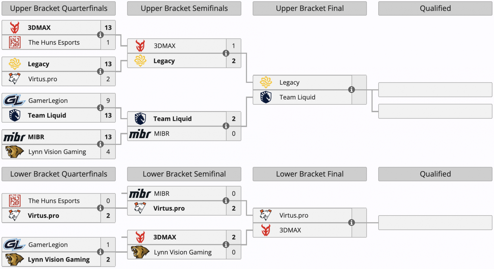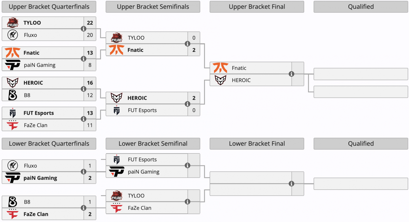 Furthermore, four more squads finished their journey in the tournament today: Fluxo lost to paiN in the first round of the lower bracket in Group B, while B8 were defeated by FaZe. In the second round of Group A losers' bracket, Virtus.pro prevailed over MIBR, while 3DMAX got the better of Lynn Vision.