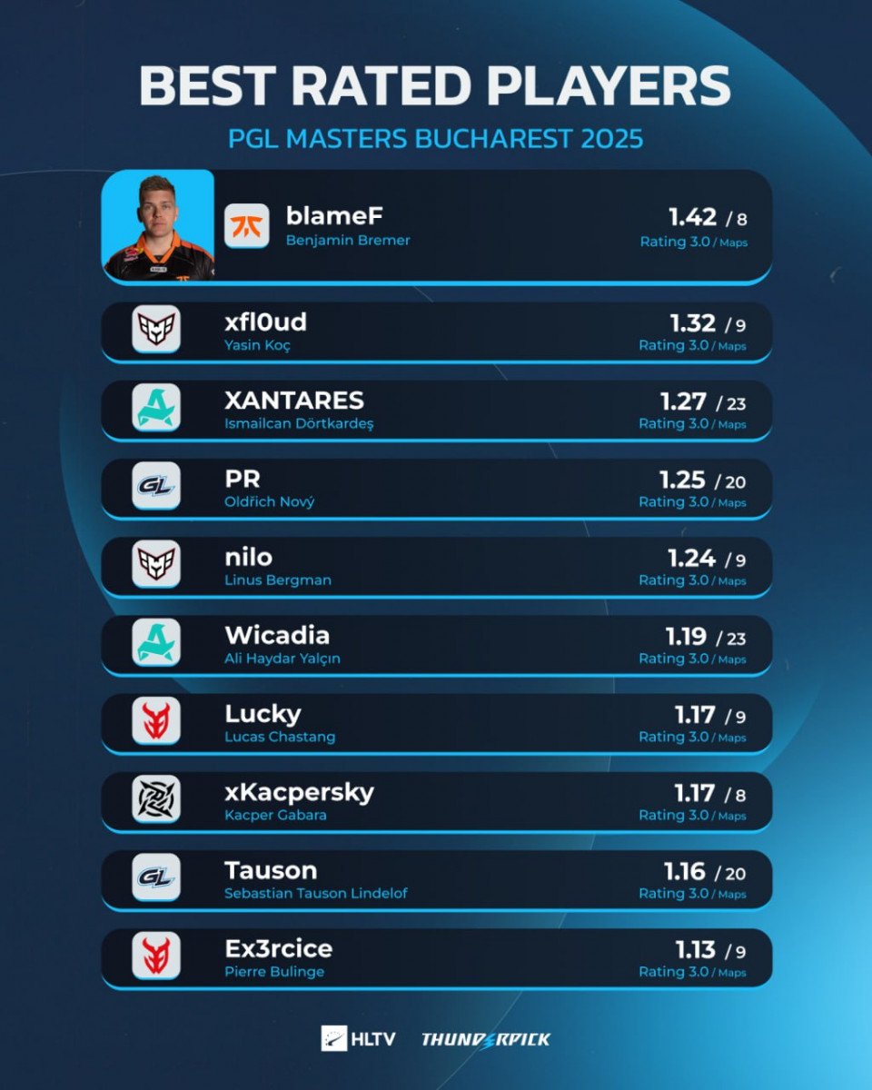 fnatic's Benjamin "blameF" Bremer finished the recent PGL Masters Bucharest 2025 Counter-Strike 2 tournament with the highest rating of all participants – 1.42 in 8 maps.