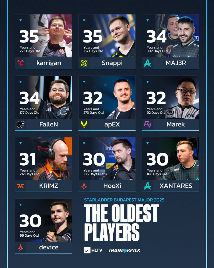 The top three oldest participants at the StarLadder Budapest Major 2025 are: