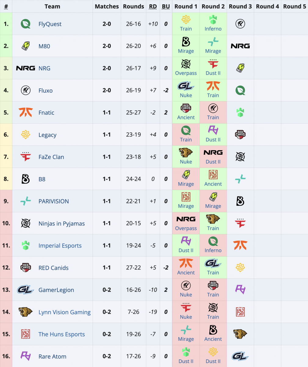 In the second round of the Swiss stage, FlyQuest defeated Imperial, M80 bested PARIVISION, Fluxo prevailed over fnatic, NRG got the better of FaZe, Legacy defeated Rare Atom, B8 bested The Huns, RED Canids prevailed over GamerLegion, while NIP got the better of Lynn Vision. All matches were best-of-one.