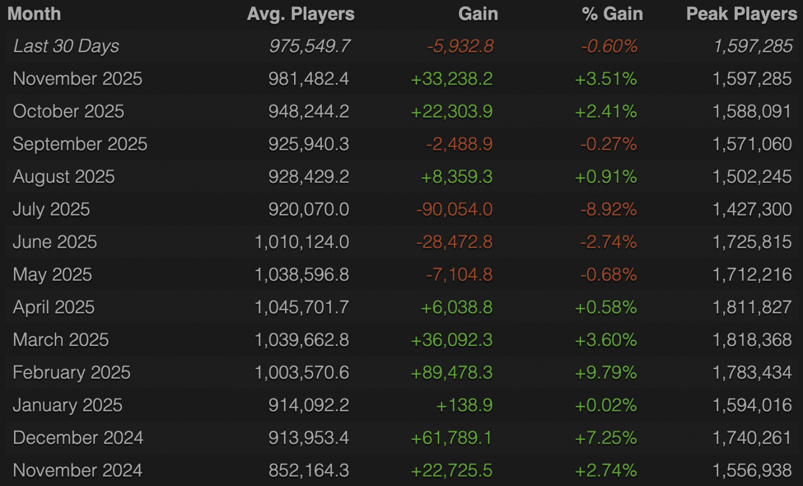 Average monthly player count in Counter-Strike 2 has increased over the past month. In November 2025, it grew by 3.51% (approximately 33,000 players) compared to the previous month.