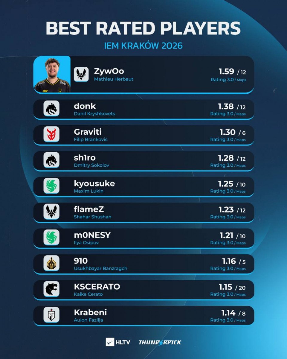 Vitality's AWPer Mathieu "ZywOo" Herbaut finished the recent IEM Kraków 2026 Counter-Strike 2 tournament with the highest rating among all participants – 1.59 in 12 maps.