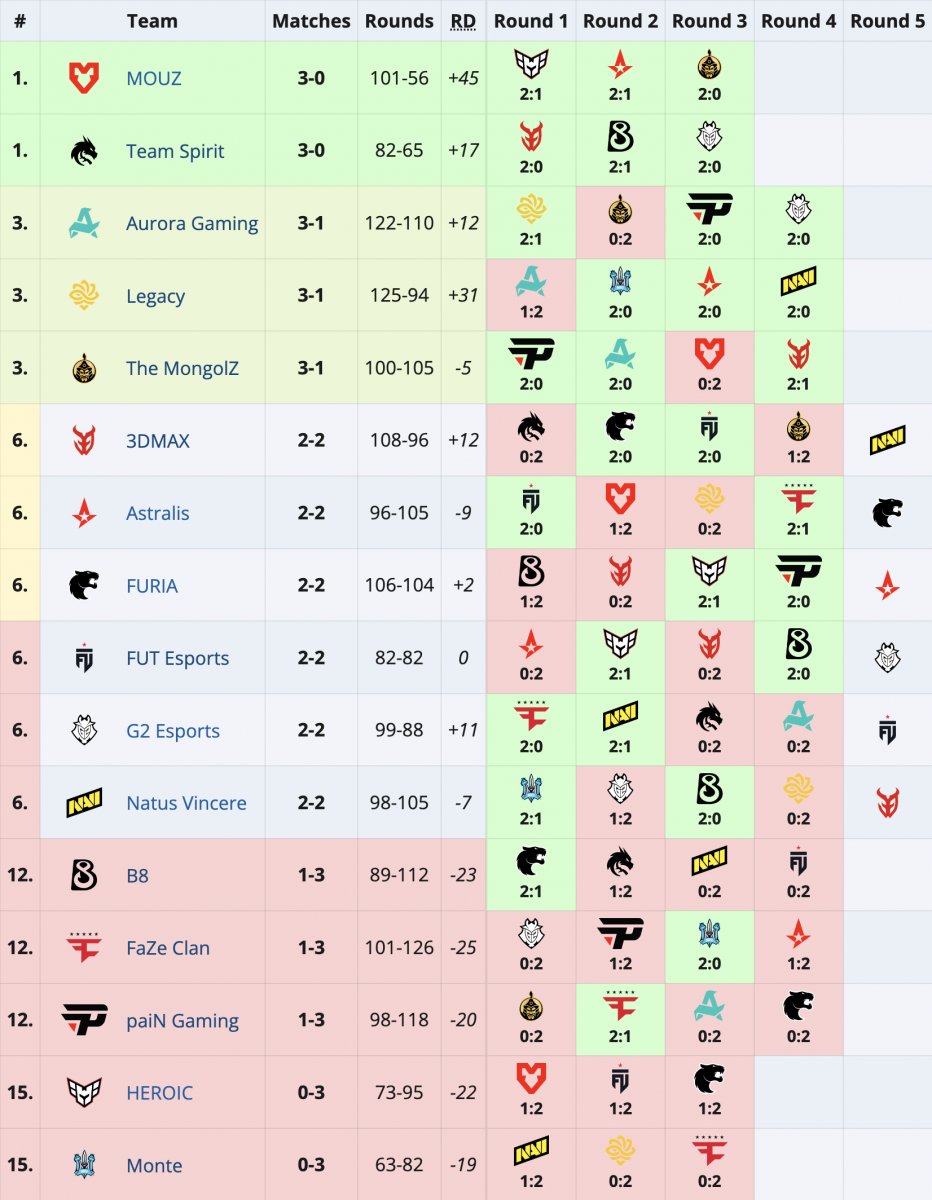 Furthermore, three more squads finished their journey in the competition today: B8 lost to FUT in the fourth round of the Swiss stage, FaZe lost to Astralis, while paiN suffered a loss to FURIA. All three teams finished the tournament with a 1-3 match record.