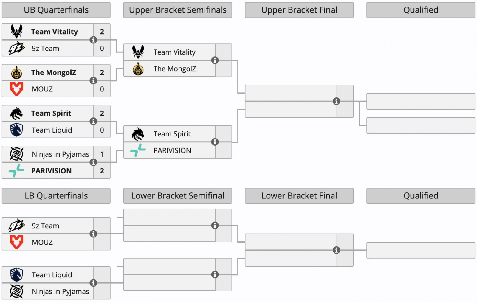 In the Group B quarter-finals, PARIVISION defeated NIP (13:11 on Ancient, 6:13 on Mirage, 13:8 on Dust2), Team Spirit bested Liquid (13:8 on Mirage, 13:11 on Ancient), The MongolZ got the better of MOUZ (13:11 on Nuke, 13:3 on Inferno), while Vitality prevailed over 9z (13:3 on Overpass, 13:5 on Nuke). The losing teams dropped to the lower bracket, while the winners advanced to the winners' round.