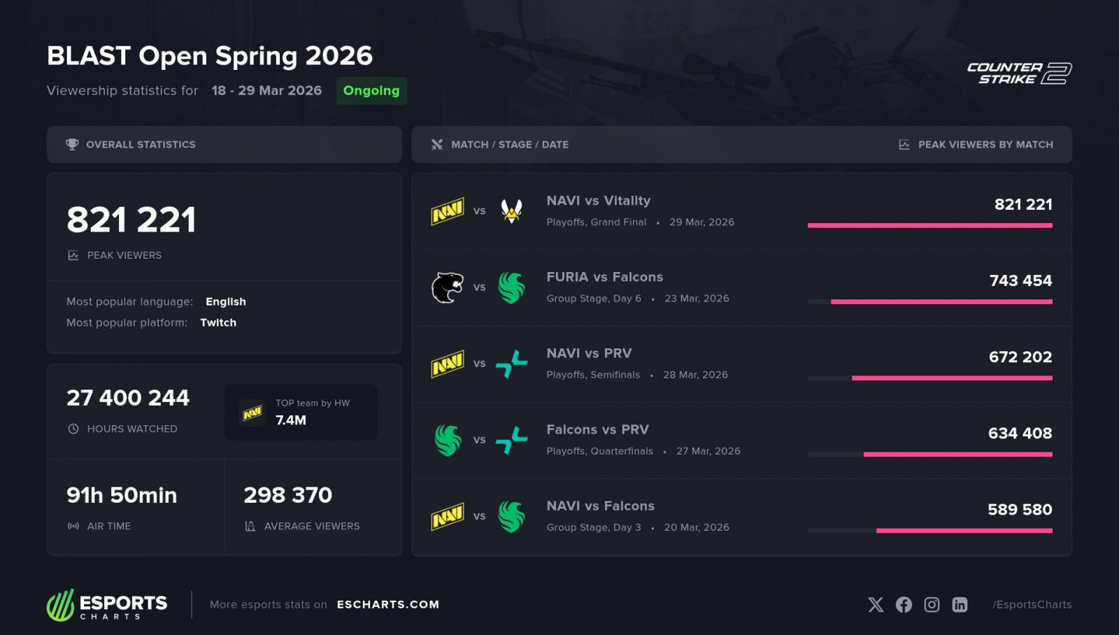 For comparison, BLAST's previous championship, BLAST Bounty 2026 Season 1, peaked at 787,000 viewers.