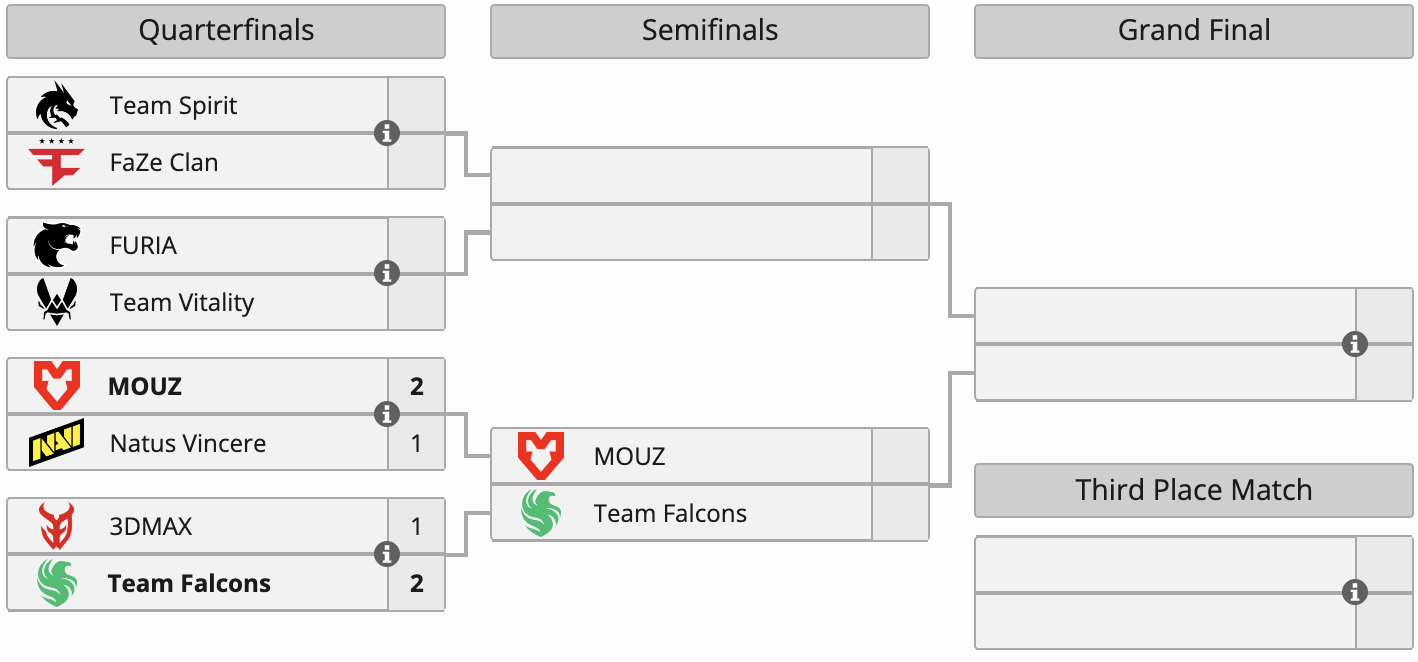 In the first round of the tournament bracket, 3DMAX lost to Falcons (13:9 on Inferno, 7:13 on Ancient, 13:16 on Nuke), while NAVI got defeated by MOUZ (16:14 on Ancient, 8:13 on Inferno, 4:13 on Train). The losing teams finished 5th-8th and earned $18,000 in prize money. The winners advanced to the competition's semi-finals.