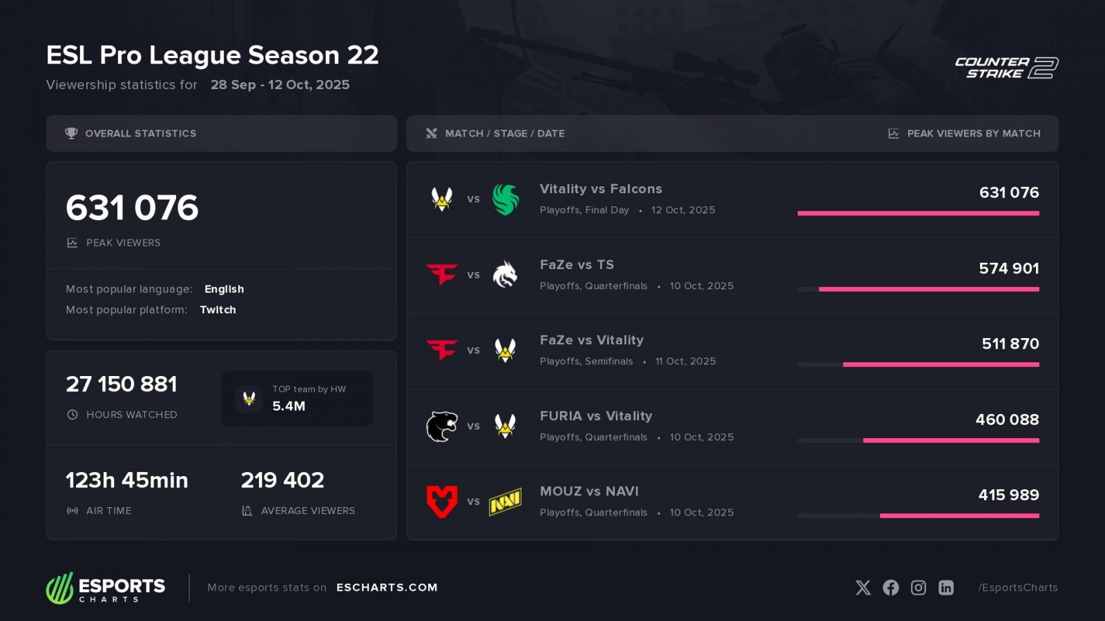 The most popular match of the event was the final between Falcons and Vitality. Matchups featuring FaZe, Team Spirit, FURIA, and NAVI also made the top five. The average viewership of the broadcasts amounted to 219,000 – the highest in the history of the ESL Pro League series. The competition was on air for 123 hours and recorded over 27 million hours watched.
