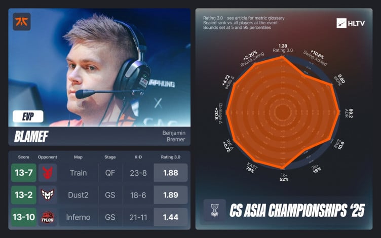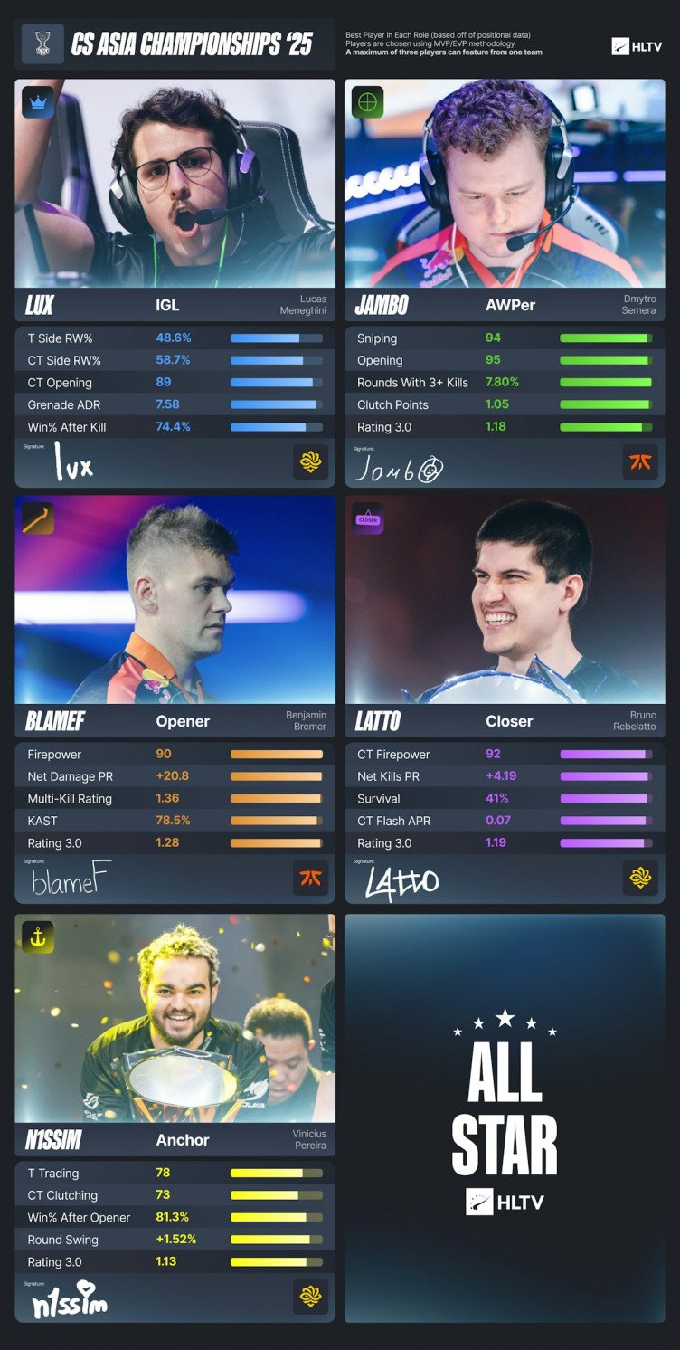 HLTV also unveiled an all-star roster of the best players from 2025 CS Asia Championships in each role – two fnatic representatives and three Legacy players.
