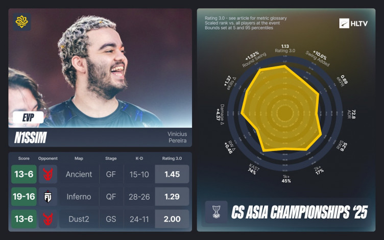 HLTV.org has published a list of the esports athletes awarded the Exceptionally Valuable Player (EVP) title following the recent CS Asia Championships 2025 in China.