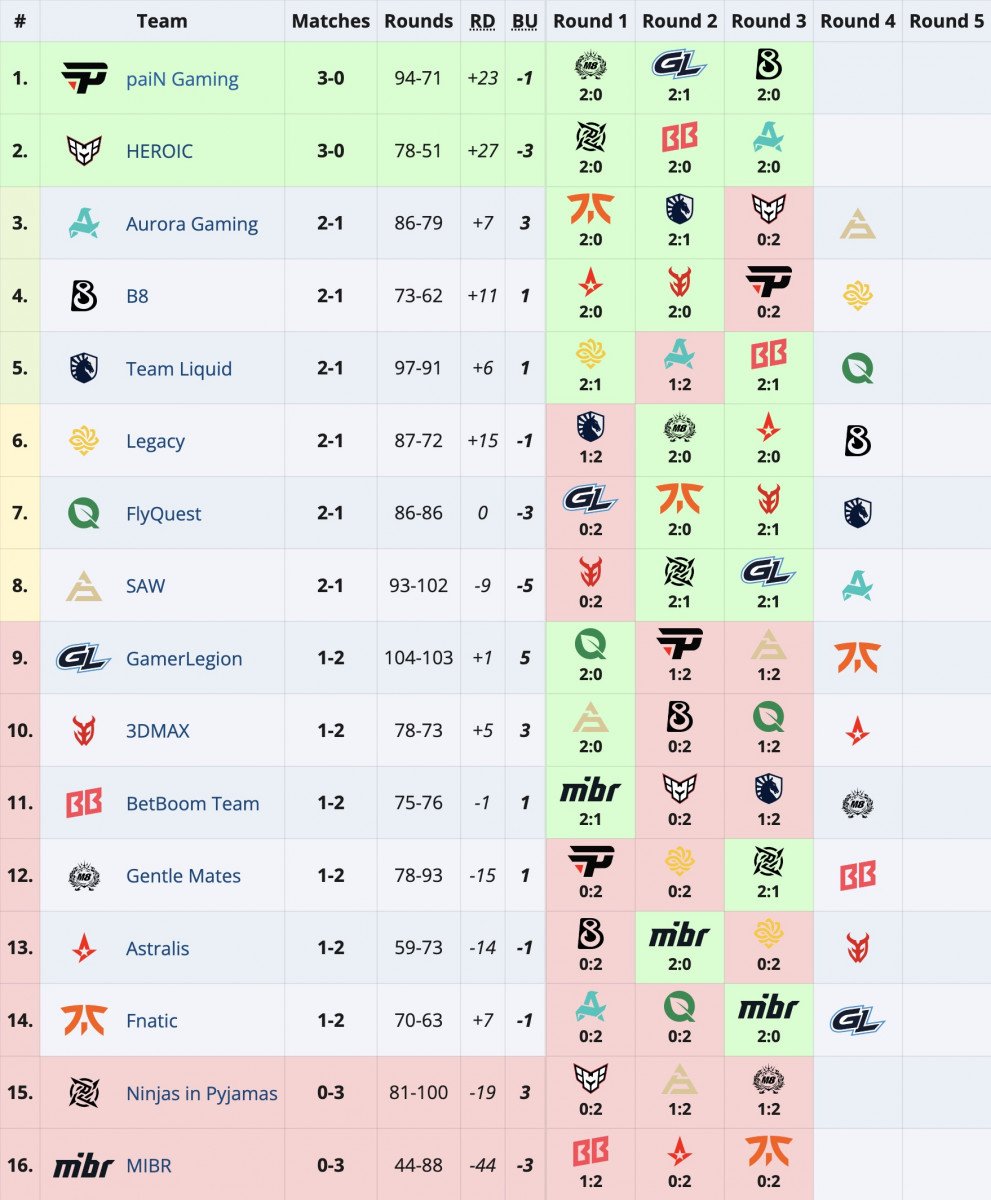 Heroic, paiN, SAW, Liquid, FlyQuest, Legacy, Gentle Mates, and fnatic emerged victorious from today's matches, defeating Aurora, B8, GamerLegion, BetBoom Team, 3DMAX, Astralis, NIP, and MIBR, respectively.