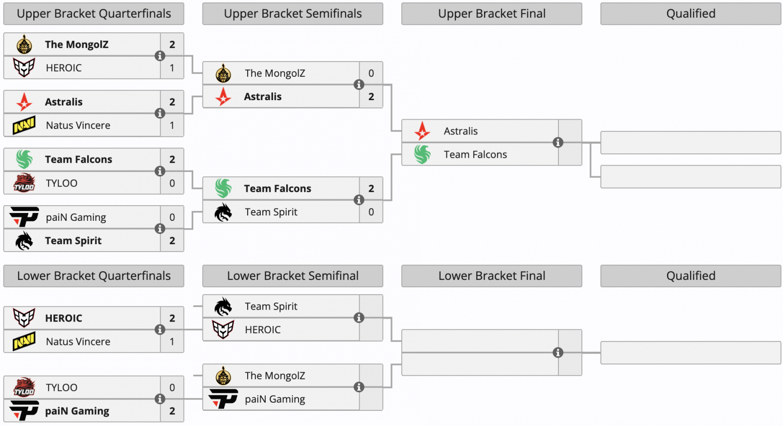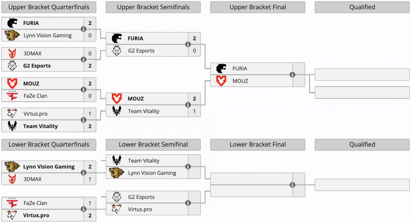 Furthermore, four squads have finished their journey in the tournament: NAVI lost to HEROIC in the lower bracket of Group A, while TYLOO was defeated by paiN. In Group B, 3DMAX lost to Lynn Vision, while FaZe fell to Virtus.pro.
