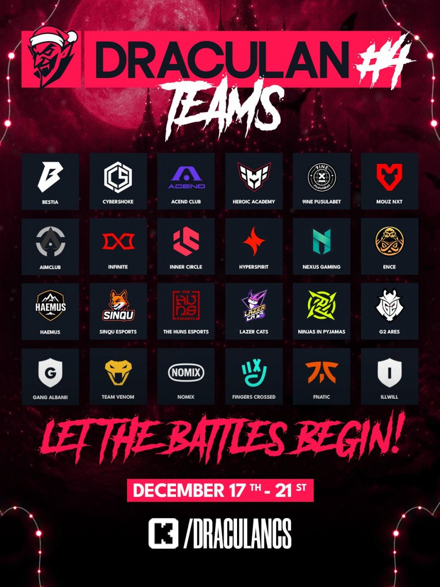 Team list for the upcoming DraculaN Season 4 Counter-Strike 2 LAN tournament has been announced. Sixteen squads will participate in the competition, including fnatic, The Huns, BESTIA, Inner Circle, CYBERSHOKE, and others.
