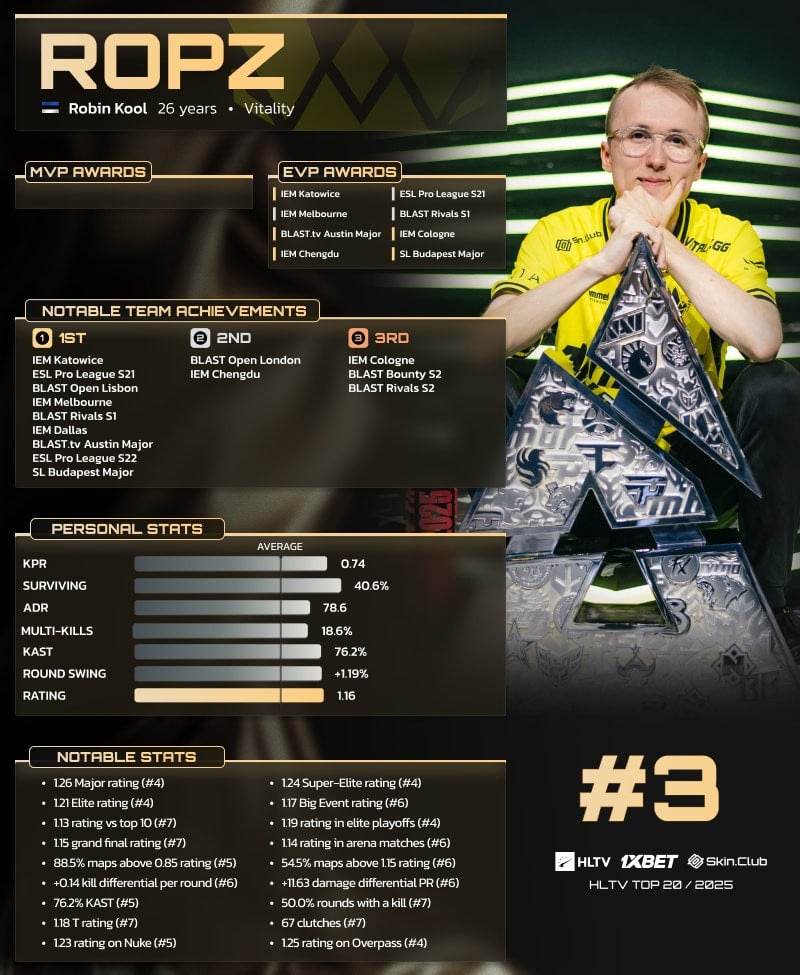 ropz, who spent 2025 with Vitality, earned eight Exceptional Valuable Player (EVP) titles. Kool finished the year with an average rating of 1.16. Among other things, HLTV.org experts noted his high ranking at Majors and other big competitions.