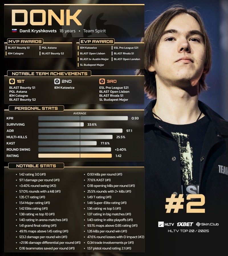 Donk, meanwhile, won four trophies with Team Spirit: BLAST Bounty 2025 Season 1, PGL Astana 2025, IEM Cologne 2025, and BLAST Bounty 2025 Season 2. His high level of individual play earned him four MVP medals (at all of the aforementioned events), as well as seven Exceptional Valuable Player (EVP) awards.