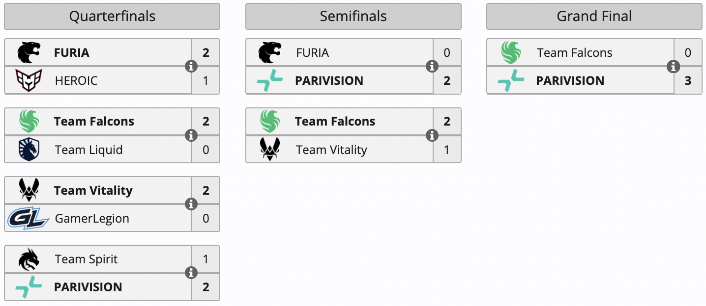 As a result, PARIVISION earned $254,687 in prizes from the event. Falcons won $71,562. FURIA and Vitality tied for 3rd and 4th place, securing $25,625 and $31,875, respectively.