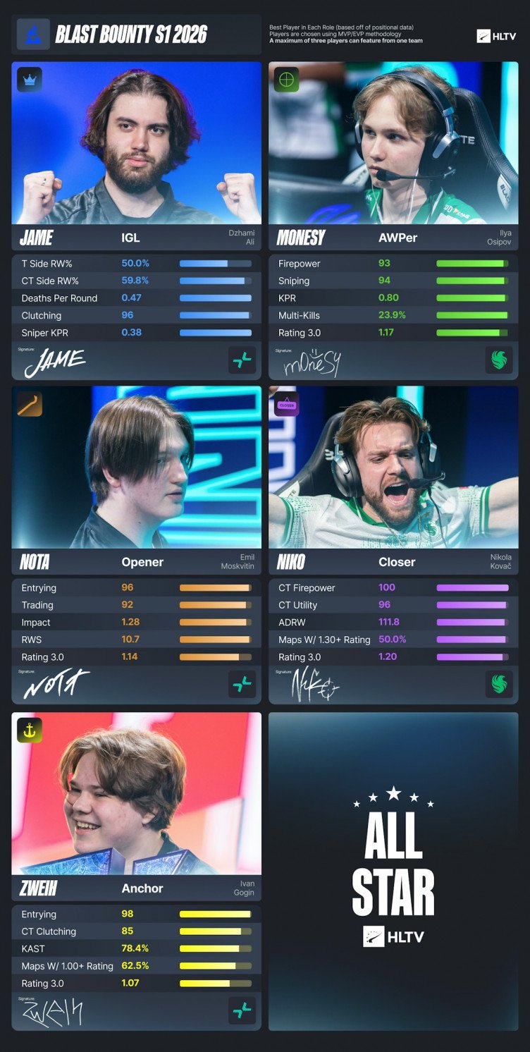 In addition, HLTV has unveiled an all-star roster featuring the best BLAST Bounty 2026 Season 1 players in each role – two Falcons representatives and three PARIVISION players.
