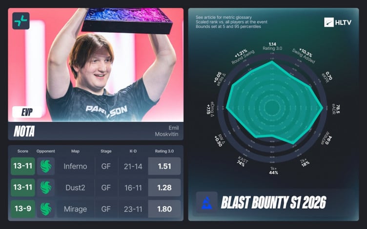 The EVP title is secured by players who demonstrate outstanding results at the event but do not receive the MVP award. At BLAST Bounty 2026 Season 1, only one player made it to this list: