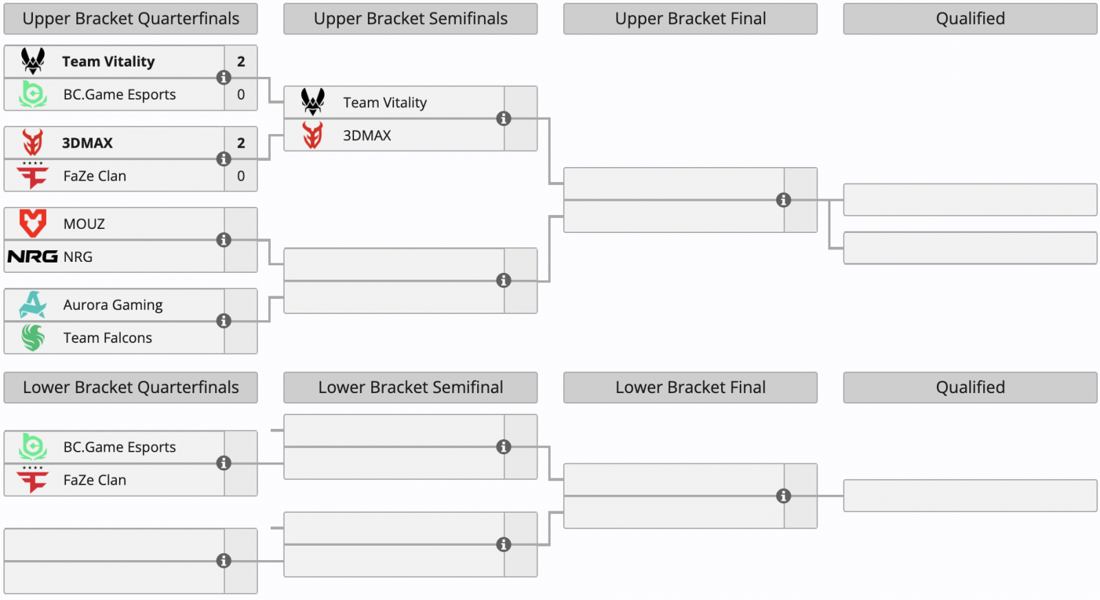 Vitality defeated BC.Game in the first round of the tournament bracket, while 3DMAX bested FaZe. The winners advanced to the next round of the upper bracket, while the losing teams dropped to the losers' bracket.