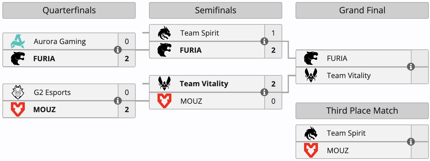 In the matches for berths in the final, FURIA defeated Team Spirit (16:13 on Mirage, 8:13 on Dust2, 13:7 on Nuke), while Vitality bested MOUZ (13:7 on Nuke, 13:6 on Dust2). The winners have advanced to the final, which kicks off today at 5:00 PM CET, while the losers will face off in a match for third place.