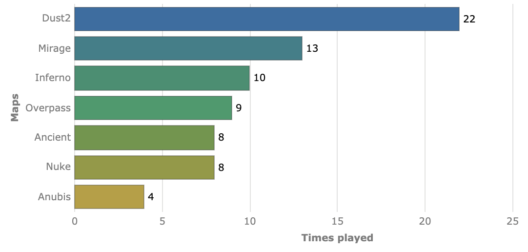 Mirage and Inferno made the top three most popular maps at the event, with teams playing 13 and 10 games on them, respectively. Overpass (9 games) and Ancient (8 games) were also in the top five.