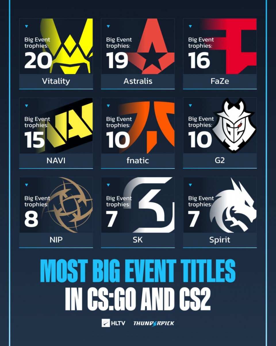 At IEM Kraków 2026, Vitality won its 20th big title, surpassing Danish club Astralis, which currently hold 19 titles. FaZe rounds out the top three with 16 big trophies. NAVI (15) and fnatic (10) also make up the top five.