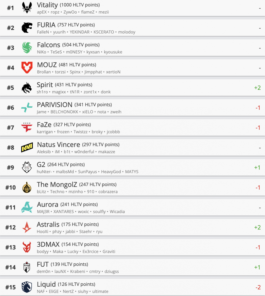 Furthermore, G2 overtook The MongolZ and now ranks ninth. Astralis moved up two positions in the list, entering the top 12. FUT rose to 14th place, while B8 – to 16th. 3DMAX dropped to No. 13, while Liquid – to No. 15.