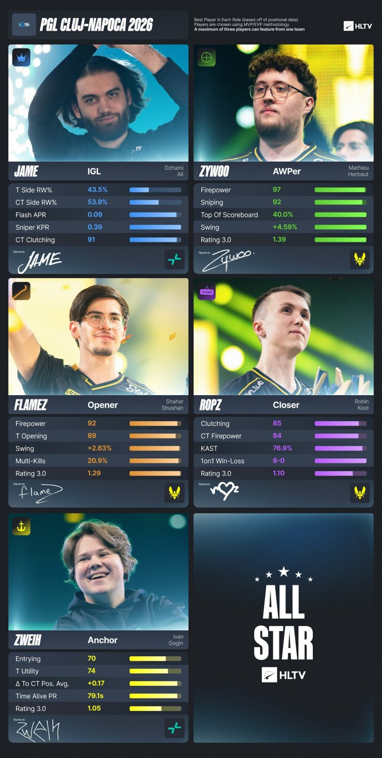 In addition, HLTV presented an all-star roster of the best players of PGL Cluj-Napoca 2026 in each role – it features three Vitality representatives and two PARIVISION players.