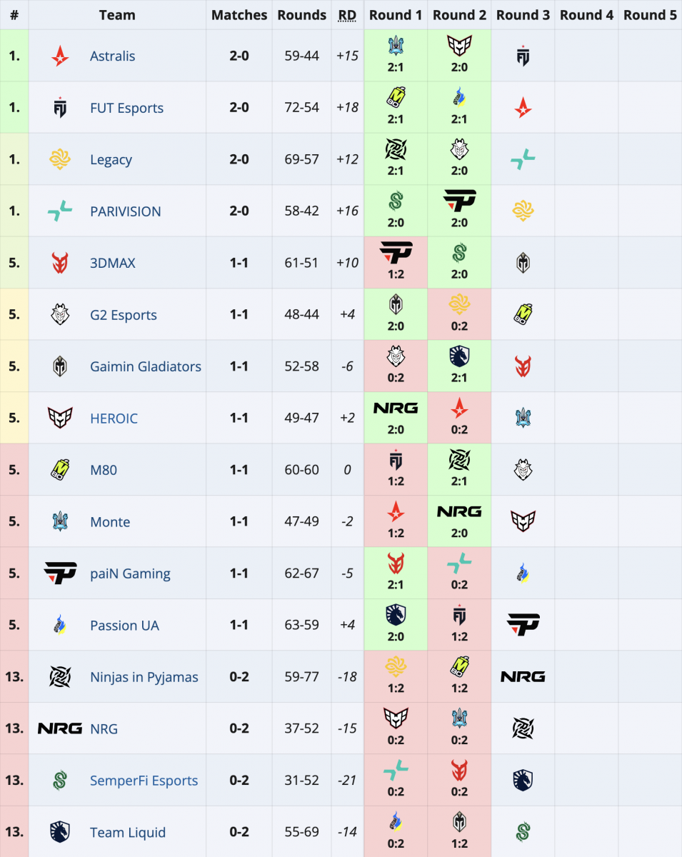 As a result, four squads (Astralis, PARIVISION, FUT, Legacy) finished the second day of the event with a 2-0 match record. In contrast, NRG, SemperFi, NIP, and Liquid have yet to win a single match. The remaining teams currently have one win and one loss to their names.