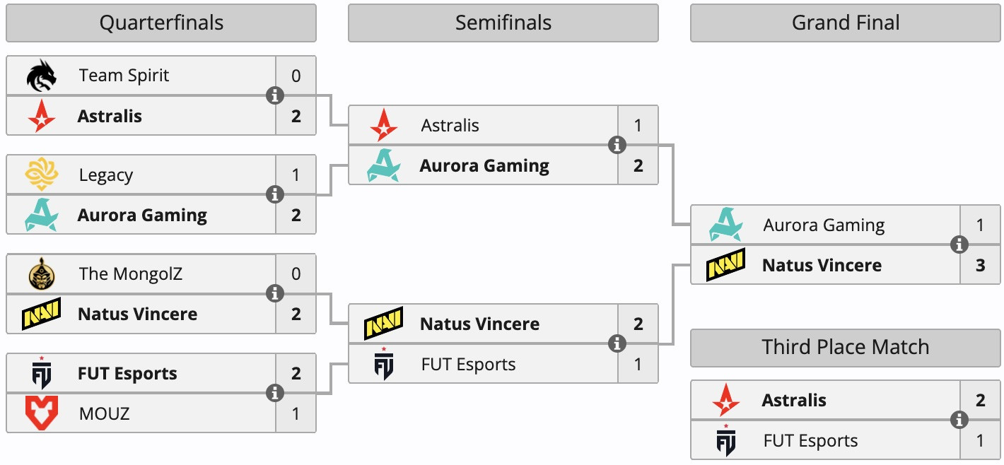 NAVI defeated Aurora with a scoreline of 3-1 in the final (13:7 on Mirage, 11:13 on Anubis, 13:8 on Nuke, 13:9 on Dust2). En route to the final, the squad eliminated FUT and The MongolZ. Aurora, in turn, bested Astralis and Legacy.